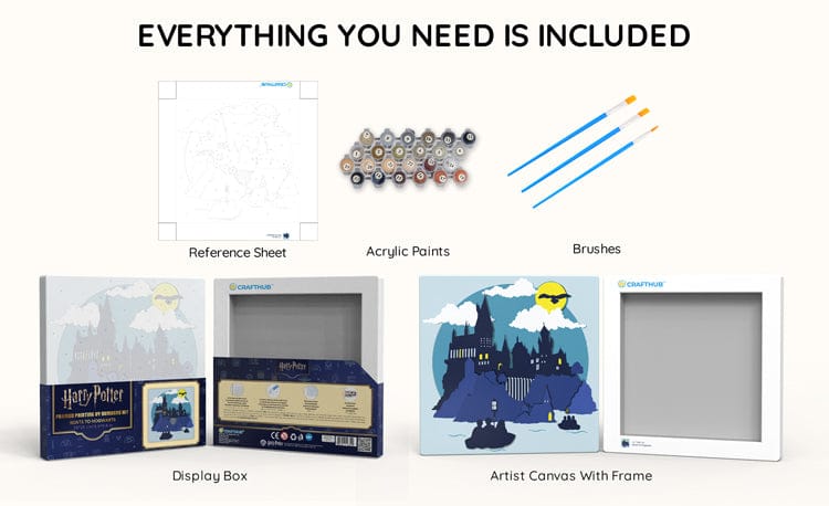 All our Canvas by Numbers painting kits include everything you need: a finely woven linen blend canvas, a pre-mixed acrylic-based paint set, four artist-quality wood paint brushes, a reference sheet of the canvas, and a helpful “Getting Started” quick guide.