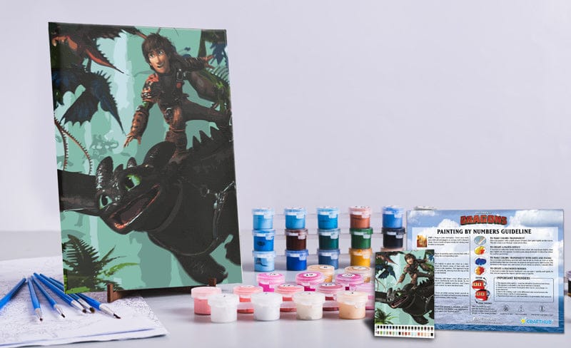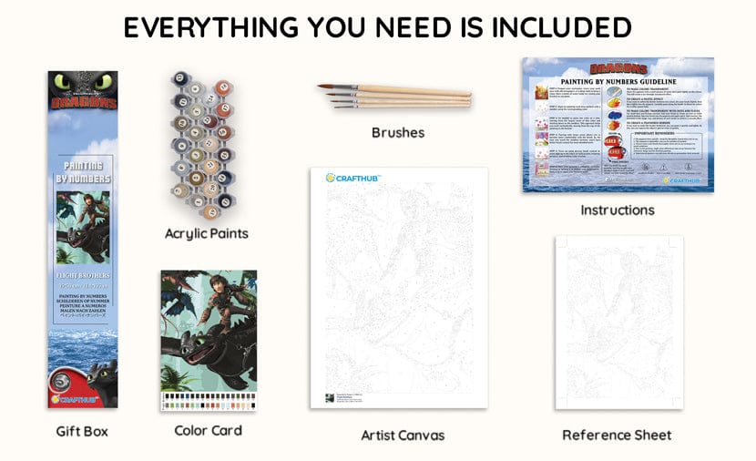 All our Canvas by Numbers painting kits include everything you need: a finely woven linen blend canvas, a pre-mixed acrylic-based paint set, four artist-quality wood paint brushes, a reference sheet of the canvas, and a helpful “Getting Started” quick guide.