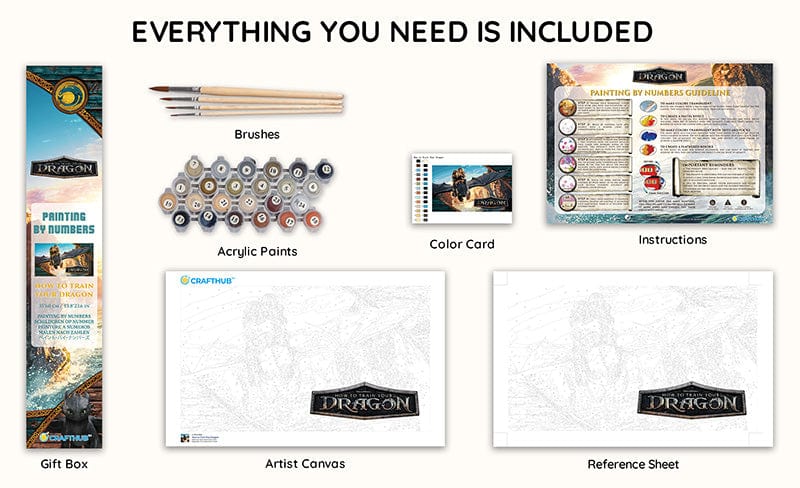 All our Canvas by Numbers painting kits include everything you need: a finely woven linen blend canvas, a pre-mixed acrylic-based paint set, four artist-quality wood paint brushes, a reference sheet of the canvas, and a helpful “Getting Started” quick guide.