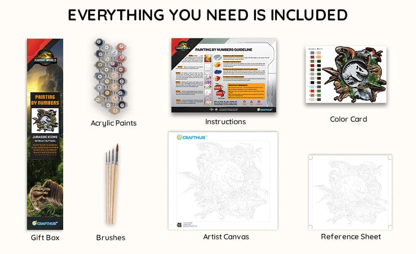 All our Canvas by Numbers painting kits include everything you need: a finely woven linen blend canvas, a pre-mixed acrylic-based paint set, four artist-quality wood paint brushes, a reference sheet of the canvas, and a helpful “Getting Started” quick guide.