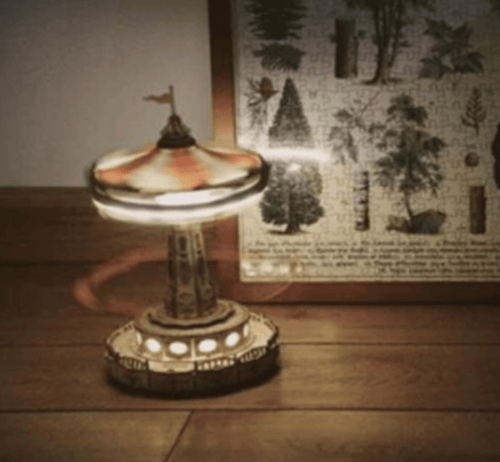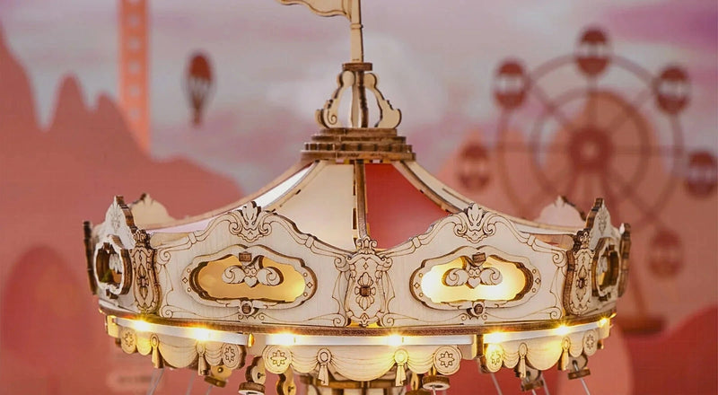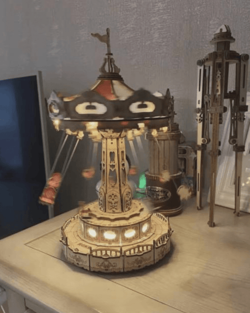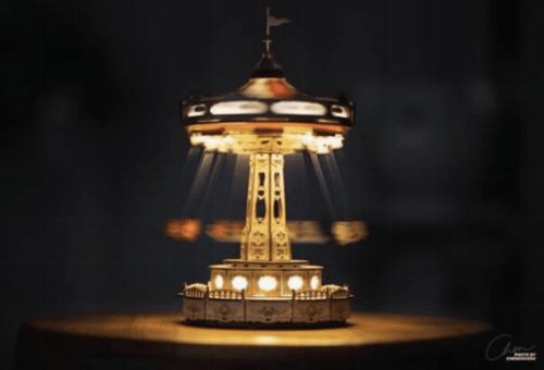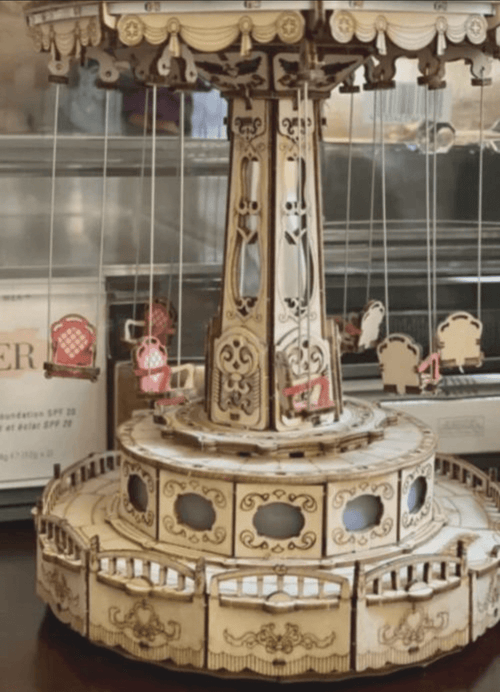 The Swing Ride Music Box retro ceiling shape, adorned with valance and lamp belt, exudes a romantic and warm ambiance, evoking a delightful classical charm. The central pillar boasts six sides made of mirror material, which, when illuminated, transforms into a mystical magic mirror, reflecting the enchantment of a paradise and enhancing the overall depth and allure. Featuring a built-in movement, the seats of the carousel will gracefully suspend from the rotating top, accompanied by enchanting music and illuminated by vibrant lights, all at the touch of a button.