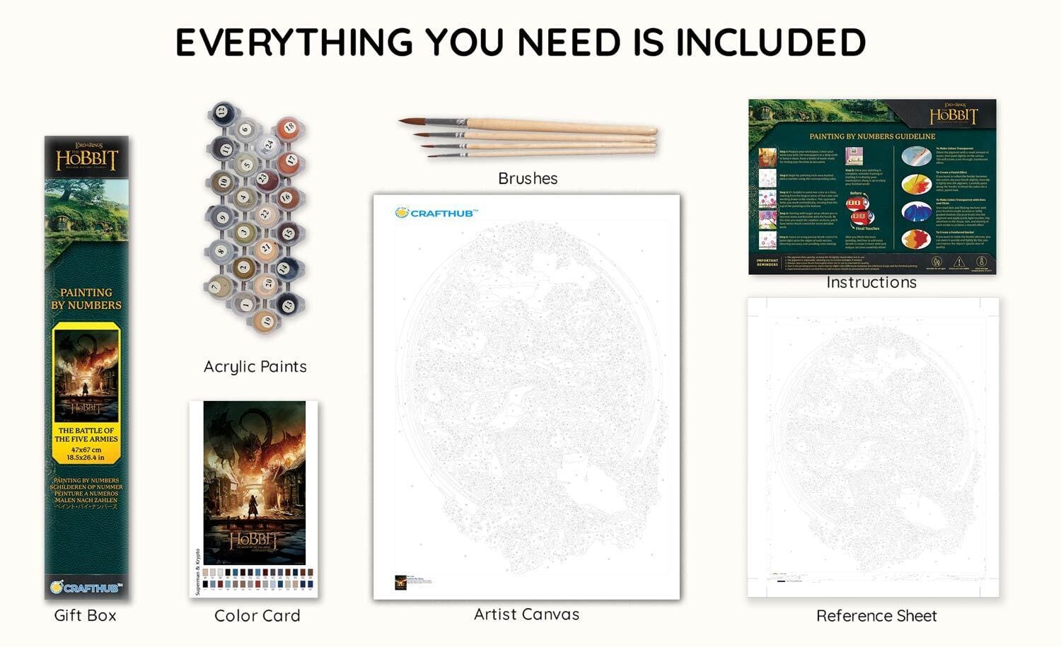 All our Canvas by Numbers painting kits include everything you need: a finely woven linen blend canvas, a pre-mixed acrylic-based paint set, four artist-quality wood paint brushes, a reference sheet of the canvas, and a helpful “Getting Started” quick guide.