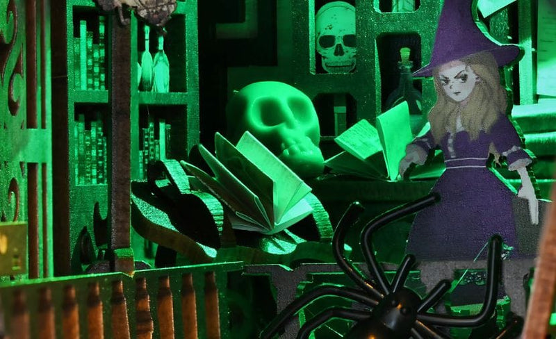 Built-in LED lighting bathes the chamber in an eerie green glow, illuminating every corner and adding to its magical atmosphere.